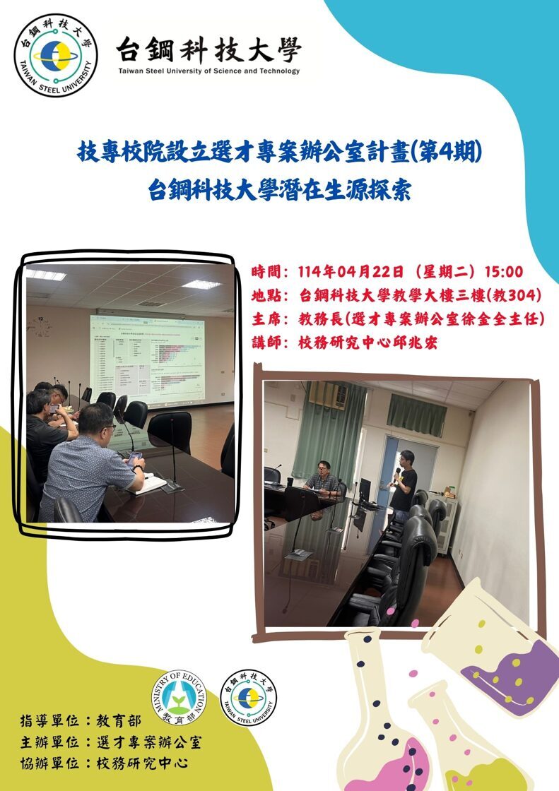 │ ● 114/04/22 活動2-自辦培訓活動 【選才專案辦公室&校務研究中心】台鋼科技大學潛在生源探索 ▸ 查看活動成果