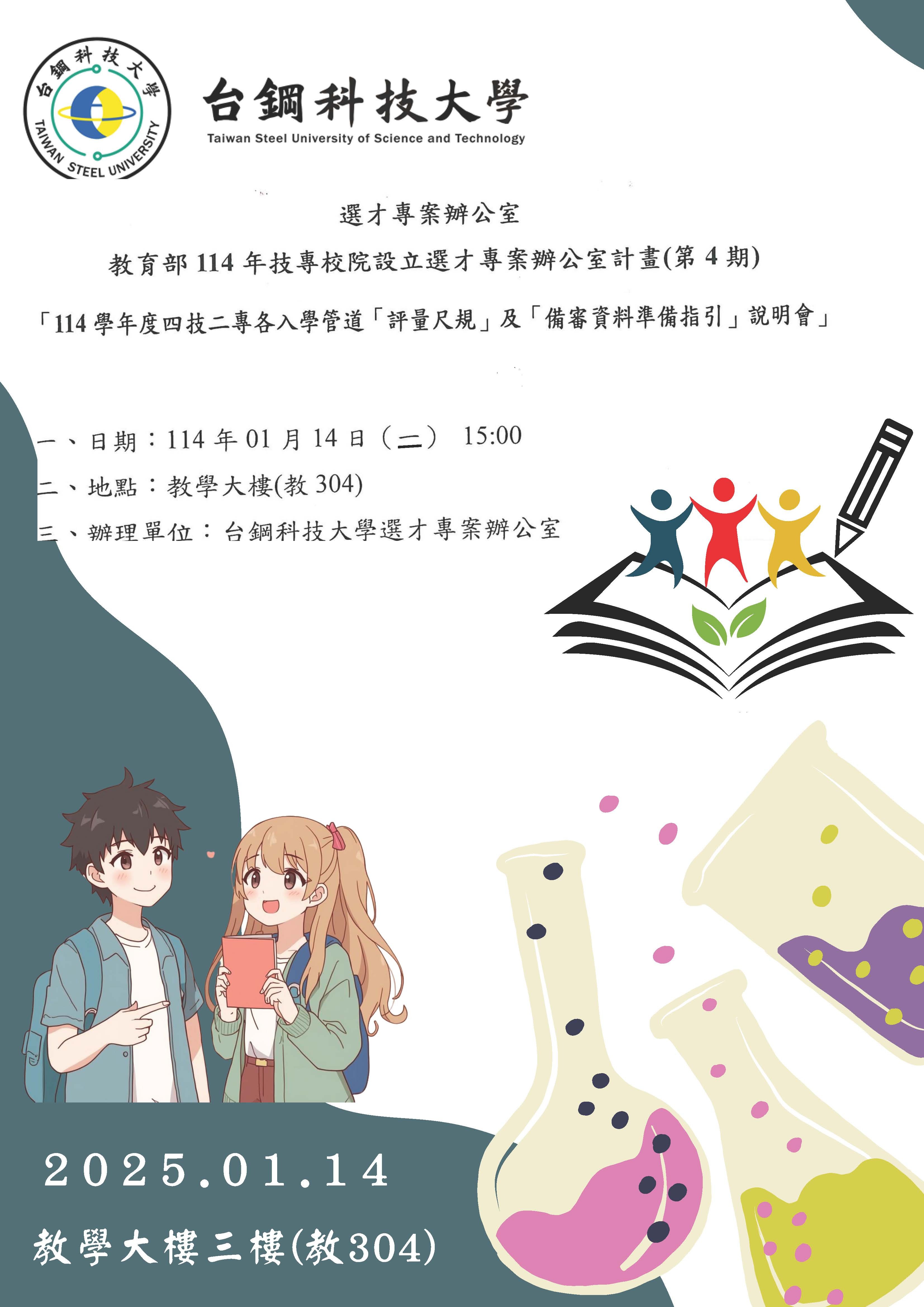 ● 114/01/14 活動1-自辦培訓活動【選才專案辦公室】114學年度四技二專各入學管道評量尺規及備審資料準備指引說明會 ▸ 查看活動成果